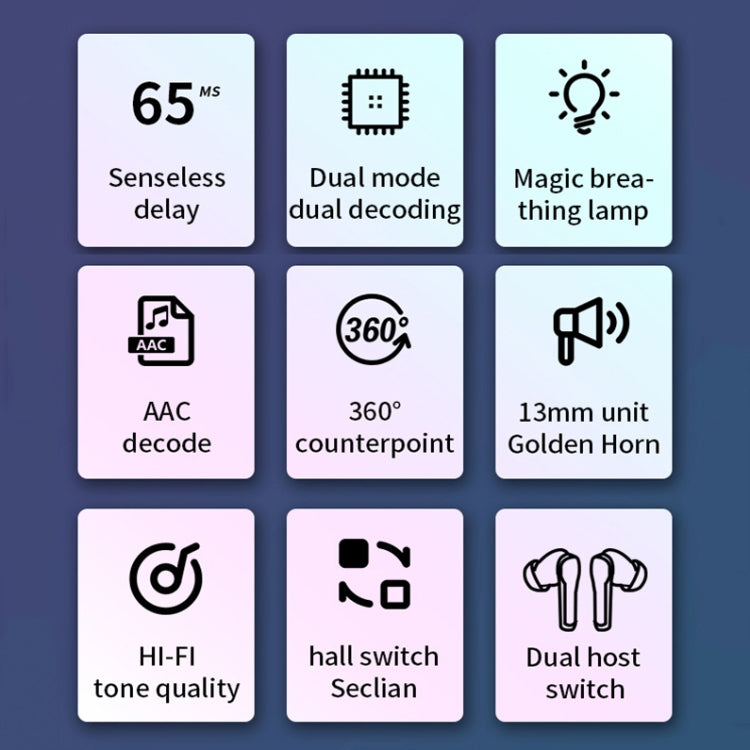 2. Features: dual mode dual decoding, magic breathing light, AAC decoding, 13mm unit speaker, HiFi sound quality, Hall switch, dual host switching, non-inductive low delay