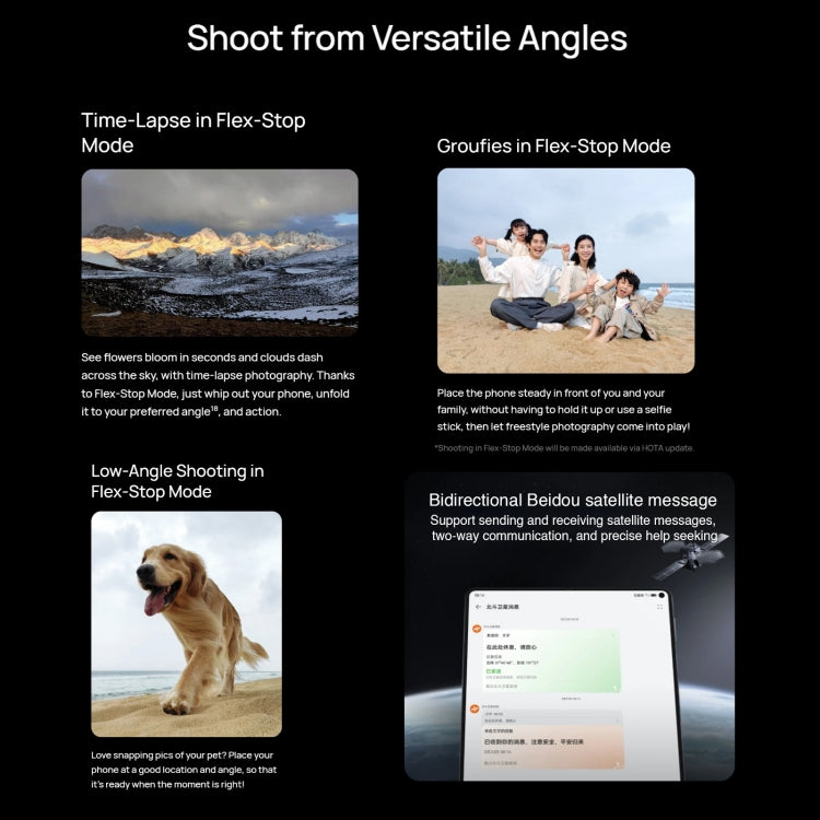 3. Rear camera: 50MP super-sensing camera (F1.8 aperture) + 13MP ultra-wide-angle camera (F2.2 aperture) + 12MP periscope telephoto camera (F3.4 aperture, OIS optical image stabilization); Front single camera inner and outer the screen: 8 million pixel camera (F2.4 aperture), you can capture wonderful moment with ease, and take high quality pictures.